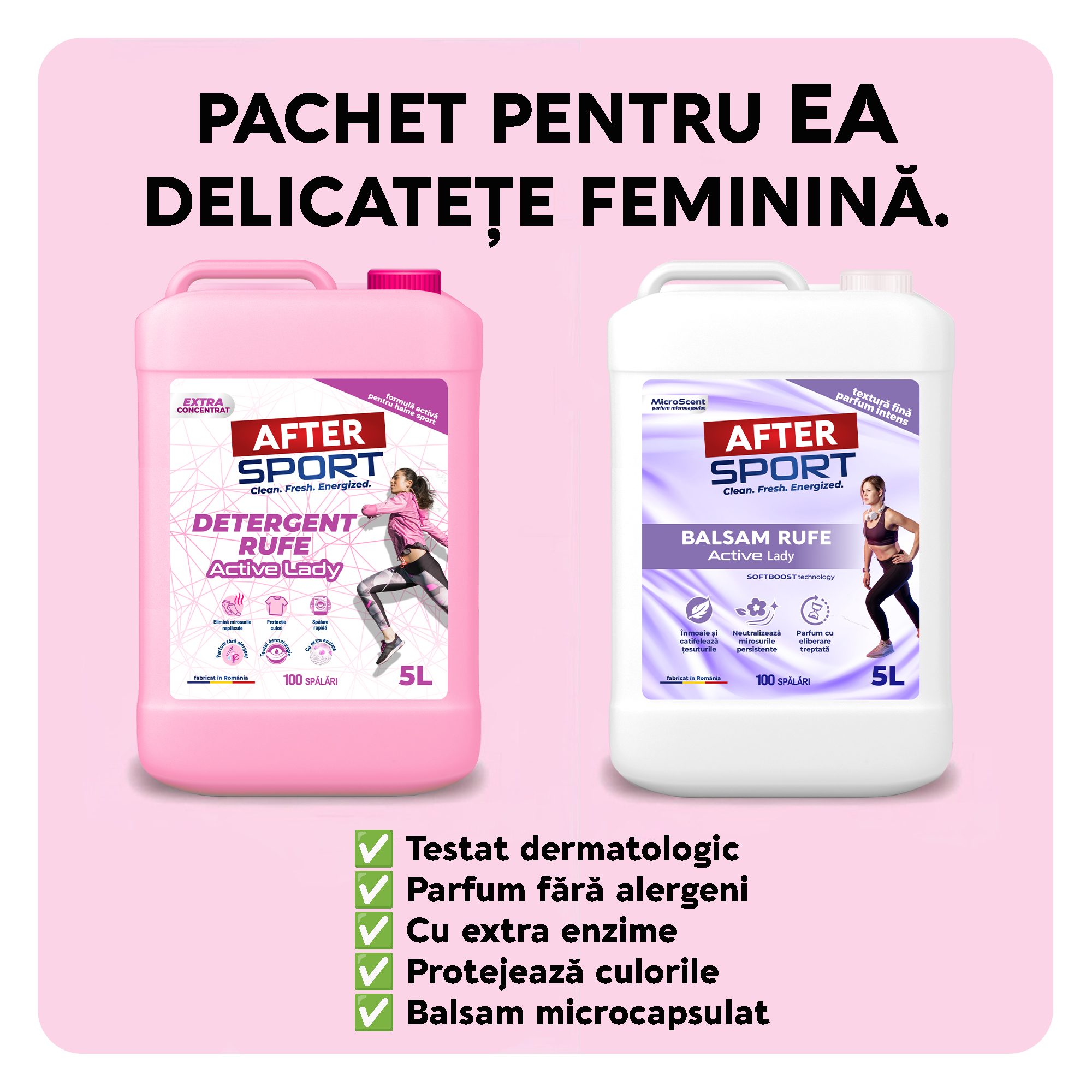Descoperă pachetul complet AFTERSPORT ACTIVELADY – conceput special pentru îngrijirea hainelor sport purtate de femei active și dinamice. Conține detergent lichid (5L) și balsam microcapsulat cu formulă concentrată (5L) , dedicate împrospătării țesăturilor sport și sintetice. În plus, primești CADOU detergent vase ecologic EcoSviz (500mL) – aliatul perfect în spălarea vaselor!
